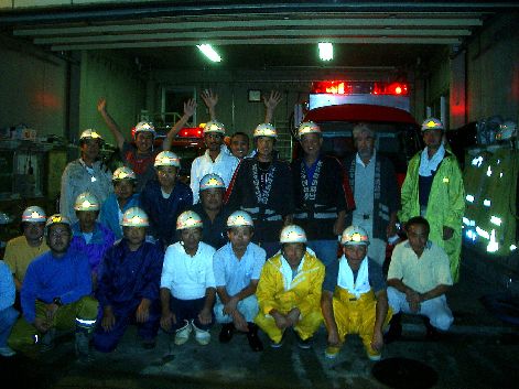 | 天変にあそぶ 朝八時から石を打ちはじめ、 休みなく硝子を磨き気がつけば、毎日夜中の十二時だ。 今日でもう五日目になる。 東大寺・整肢園へのオブジェ<風しるべ>に入れる <ルシャナのいつくしみ>の書が森本住職から届いた。 削りだした<虹しるべ>に嵌める 大きなプリズムの研磨もやっと仕上がった。 曇った空からつかの間差し込むヒカリに当てると、 五剣山に繋がる棚田の石垣に大きな虹が現れ 咲き始めた彼岸花が、 いっせいに七色に染まったような気がした。 通りかかった親子が地面の虹を見つけて立ち止まる。 太陽が雲間に隠れ虹が消えて不思議がる子供。 「このヒカリを<風しるべ>に当てるんだよ!」。 ![]() 「今、思いついたんですか?」 「東大寺の整肢園に行ったときに すでにこの考えが出来ていたんだ」 嬉しそうなヨシも 「うどんでも喰いに行きますか」 カバンの中からオレのハイライトを出して言う。 『うまくいったワイ…』 タバコもうまい。 床下浸水の前回に続いて、 近づく今度の颱風はまた高松を狙っているようだ。 「今晩は消防団の招集がかかりそうです」 ヨシはまだ残っているオレのシゴトを 心配しているようだ。 「あとはオレ一人で大丈夫だ。いつでも行けよ」 それでも石工の書生として見届けたいようだった。 うどん屋から出たら、五剣山を呑み込んだ 真っ黒い雲の縁が慌ただしく蠢いていた。 「ワクワクしてくるなぁ」 ゲージツの高まりに天変の予感が重なって、 低気圧と共にオレの身体はヒートアップしていた。 はたしていよいよ風雨が強まり、 脇の遍路道も小川になっていた。 カリンもイチジクも大揺れで、 五時になるとシャッターを裏から支えるように トラックやパワーショベルを止めて、 職人等は帰ってしまった。 事務所と工場を往き来出来ないくらいに 横殴りの雨になり、 誰もいなくなった広い工場にヨシと二人残って オレのシゴトはまだまだ続く。 もし緊急が掛かるとしたら九時ごろで、 そうなれば満潮の十一時過ぎまで見回りして、 分署で待機しなけりゃならないらしい。 満潮と高潮が重なった前回は、 川が決壊してたちまち床下浸水に寝たきりの 独り住まいのジィさんをヨシが救助したという。 颱風通過時間と満潮が重なる今回も 充分危険信号である。 トラバーチンの粉末まみれで、 目尻や顔の皺に沿ってひび割れた 田舎芝居の役者みたいになった顔を 見合わせて吹き出した。 すでに風雨が工場を襲う音は、 オレが発するコンプレッサーの打撃音を越えていた。 こんな天変は久しぶりだった。 『オレも名誉分団長だ』 と無事通過を願う半面、 暴風雨のなかゲージツにひたすらピッチをあげる 内心の部分では、 天変に土嚢を運ぶ最悪も期待しているオレがいた。 石子で曇っている工場の硝子が紅く点滅していた。 警察の警報灯である。 「やったのか」 「そんなヒマなぞなかったじゃないですか」 「こんな嵐の夜は、とんでもない凶悪も舞い込むものだ」 とオレは削岩機を機関銃のように身構えた。 懐中電灯を先頭にズブ濡れの 白いヘルメットに黄色い制服が三人入ってきた。 「まだやっていたんかい」 マツヤマさんが微笑んでいる。 カン助がいる。 字彫り屋もいた。 みんな牟礼消防団第三分署の面々である。 九時に緊急招集が掛かっていたらしい。 大時計はすでに十時半だった。電話連 絡に気づかなかった消防団員のヨシは、 しきりに恐縮していた。 「オブジェ間に合うんかい。こっちは大丈夫だから、 シゴトを続けてよ」 班長のマツヤマさんはオレのゲージツを気遣ってくれた。 潮も思ったほど上がってないらしい。 「十一時には分署へ行きます」 ヨシは敬礼をして見送った。 普段では信じられない速度で <虹しるべ>がほとんど出来上がっていた。 ヨシの軽トラで分署に駆けつけると、 消防車の周りには団員がたむろしていて、 見回りから戻った者がカップラーメンを喰っている。 「遅くなりました」 オレは団長の八百屋のハツちゃんに挨拶をした。 「こんな遅くまでご苦労さん。 腹空いたろう、ラーメンでも喰ってよ」 いつものようにニコニコと逆に気遣ってくれた。 小さな町だからみんなオレが毎日朝から遅くまで 石に向かっているのを知っているのだ。 石工の関係が多い団員等と雑談をしていると、 風も止み雨も小降りになっていた。 どうやら半分の願いの方が克って、進路が変わったらしい。 「了解しました。こちらは全員で二十三名」 ハツちゃんがいつになく真剣な団長顔で 無線交信している。 整列した全員に 「キヲツケ、カシラーナカッ!」 副団長の号令、 「十一時警報解除! カイサン」 団長の声に敬礼、 解散になり土嚢運びは無しになった。 アッという間にみんな家路についた。 「お前のカミさんはまだヨン様を観ている時間だろ、 高松港の潮位でも見にいくかい」 「イイですね」 昨夜の夜中に工場からドヤドヤと戻ると、 DVDを観ていたカミさんに 「独りの時間に浸っているのに」 と小言を言われ
