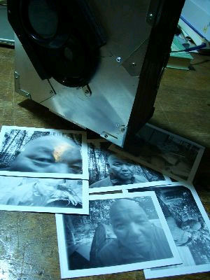 | ミクロの空気レンズと蒲鉾 春めいた山に誘われた山菜狩りや、 自然愛好者のキャンピングカーが 県道を往き来しはじめた。 うっかりFACTORYの大シャッターを開け放って シゴトをしていると、 ワゴン車が敷地内に突っ込んで来た。 『しもうた!』と思ったが後の祭りだ。 こんな時は無視して工作を続けるに限る。 しかし敵はお構いなくぞろぞろ降りてきて 「こんなトコでやってるんだぁ」 なぞと挨拶代わりにケイタイをかざす。 珍しいオオムラサキ蝶を見つけたように、 一斉に舌打ちのようなシャッター音で 撮りだすではないか。 呆気にとられていたが、 ケイタイ族は嵐のように去っていった。 いっそ嵐や花粉なら歓迎なのだが、 ヒトだから質が悪い。 中断されないように 県道に面した大シャッターを降ろすと、 鉄の粉塵が積もったボロラジオが、 ノイズにまみれた隠蔽とジンドウの微弱な電波を スクラップにしていた。 四×五判のフィルムが入る木製の<写真箱>が、 ついに出来上がった。 次はもっとも大切な作業だ。 入浴剤の原液で真っ黒に腐食させた銅板に、 マイクロドリルの刃先で〇.三ミリの孔を開ける。 この精度のいいミクロの孔が、 <写真箱>のなかに倒立するヒカリを導く 空気のレンズになるのである。 ![]() 針孔が創る世界を凸版に変換し、 プレス機で転写する方法で 頭蓋内を満タン状態にしながら、 東京駅の構内を歩いていた。 西に向かう新幹線に乗るためだ。 陰画と陽画が交互にフラッシュしていたオレの前から、 一瞬、世界が消滅した。柱に激突したのだ。 先日も、村に下る自転車に乗っているコトが希薄になり、 途中のカーブを回りきれずに、 水を張った田圃に転落したし、 このところ<写真箱>とイリュージョンの転写を 頭蓋に巡らせながら過ごすことが多いから、 日常の真空地帯に堕ちこむことが多い。 歳はとりたくないものだわい。 痛いやら、格好悪りぃやらで、 新幹線に飛び乗った。 去年のヒカリ繭で奈良の<燈花会>に 参加したおりに知り合った<明新社>を訪ね製版を見学。 これから本格的にはじめる自分の版画の 新しい企みの参考になったが、 課題は深まり頭蓋内はますます大騒ぎである。 ドブに落ちないように気をつけよう。 今年はオレの日程の都合で <燈花会>には参加出来ないが、 夜、久しぶりに奈良の面々とエン会だ。 去年、<ヒカリ繭>を象った蒲鉾を作って祝ってくれた 蒲鉾屋<魚万>の若旦那も、 仕事を切り上げて駆けつけてきた。 呑むほどにオレはイカの蒲鉾は出来ないものかと バカな考えが浮かんだ。 「秋には大きくなるスルメイカの赤ちゃんは、 ムギイカといって柔らかくて美味いんだが、 麦が獲れる今が旬なんだ」 水をむけたオレは、 実直な蒲鉾屋の目が光ったのを見逃さなかった。 「赤ちゃんですか。面白いねぇ。 ところで全部イカだけ作るの」 「もちろんムギイカだけの混じりっけ無しさ」 オレは意気込んだ。 「でも、それやったら、ただのイカですやん」 イカは熱を加えると固くなって ゴムチューブみたいになるという。 彼は、すでに何かアイデアがありそうだった。 「そうだな、任せるよ。 明日釣りに行ってすぐに送るから」 「あんまりいっぱいはいりません」 「わかった。釣れないかもしれんじゃないか。ヨロシク」 翌朝の新幹線で途中下車、 カーペン君と落ち合って伊豆の戸田港、 夜六時<福将丸>でイカ釣りに出た。 竿を使わない直結仕掛けを船頭に教わって、 漁師のようにリズミカルにひたすら手繰る。 三時間半ほどで九十二匹。 暗黒の海に灯りを点けて漂ったジカンは 他のことを考える余裕もなく、 海に落ちるコトもなく大漁だった。 一〇〇匹で一束というのだが、 あと八匹は次の楽しみにして、 マストに綱を張って開いたイカを夜風に干す。 ![]() 魚万に蒲鉾用をクール宅急便で少し送った。 どんな蒲鉾が出来上がるやら‥‥。 山梨工場に戻って、 写真箱のシャッターに改良していると、 カメラマンの小川さんが 中古屋で格安の四×五カメラを見付けて運んできた。 ボディだけでもちろんレンズはない。 さっそくアルミ板を削り前板を作り、 ヒカリを完全に塞ぐ針孔のシャッターを工夫した。 空気のレンズでスローな時間で捉えたイリュージョンを、 転写した<版>にペインティングするのである。 |