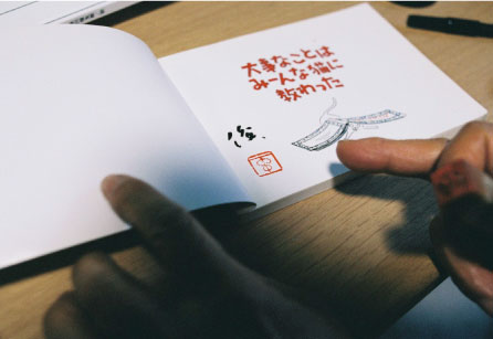 | 谷川 | サインがほしいっていうひとが増えるとさ、 一生懸命書いてるとくたびれちゃうから、 かんたんにパッと書けるやつがいいね。 |
