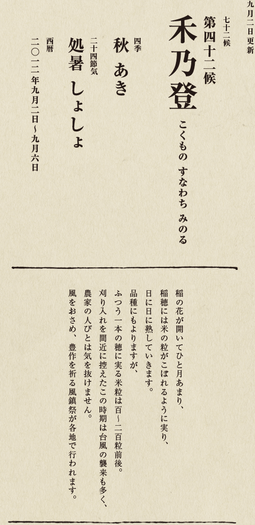 | ── | 担当編集も気づきませんでした。 失礼いたしました。 ハゼドン、見てたのになあ。 さて! あっという間に次の季節。 1年を72で割ると、こんなに早いんですね。 1週間より早いですね。 あたりまえですけどね。 「禾乃登」でございます。 「こくもの・すなわち・みのる」 ということは‥‥。 |