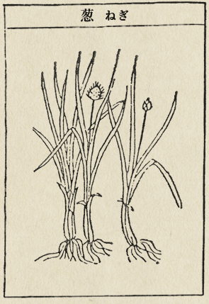 | だいたいネギ科っていうか、 葱の仲間って、大蒜(にんにく)とか 韮(にら)とか全部そうなんですけど、 『和漢三才図会』を見ると 仲間がいっぱい並んでいますよ。 葱を「ひともじ」 韮を「ふたもじ」っていったり。 女房詞がありますね。 |
