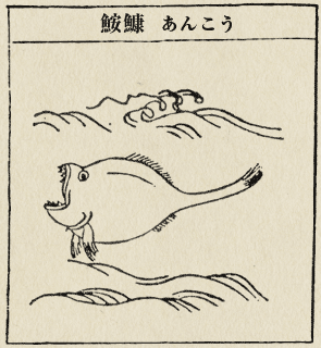 | ── | 鮟鱇引いてみません? 「飲食事典」で。 どれどれ‥‥。 「アンコウ科の海産(?)硬骨魚。 頭が甚だ大きく目も大きいが 尾は急に細くなって釣り合いがとれず 大きさは130~170センチ」!! |