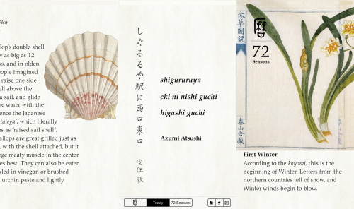 十二候。一年は、単に4つでも、6つでもなく、72の小さく、繊細な季節に分かれる。どれも1週間にも満たない、365日のうちの72の簡潔なスナップ写真が、一年を通じて私たちを取り巻く世界の微妙な変化を捉えるのである。 ![]() |