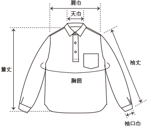 | 着丈 | 肩巾 | 胸囲 | 袖丈 | 袖口巾 | 天巾 | 前下り | |
