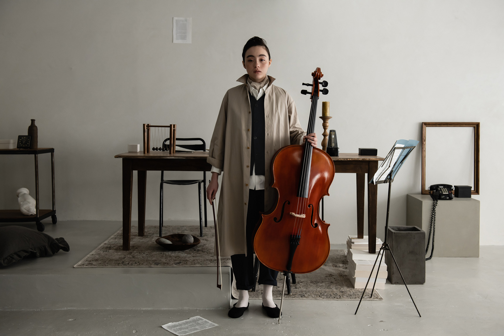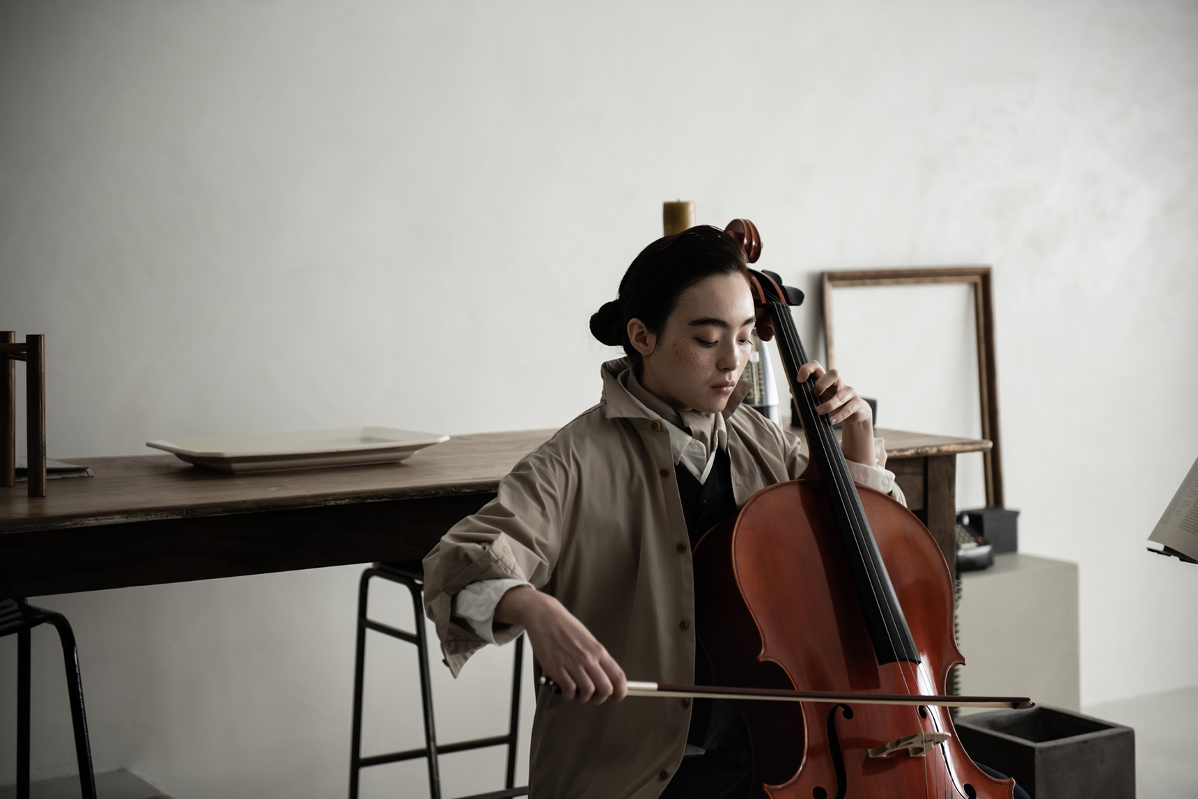 襟つきシャツらしい、すっきりした見えかた。そのバランスが新鮮です。