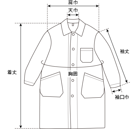 | 着丈 | 肩巾 | 胸囲 | 袖丈 | 袖口巾 | 天巾 | 前下り | |