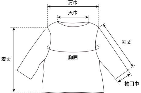 | 着丈 | 肩巾 | 胸囲 | 袖丈 | 袖口巾 | 天巾 | ||