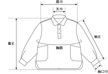 | 着丈 | 肩巾 | 胸囲 | 袖丈 | 袖口巾 | 天巾 | 前下り | |
