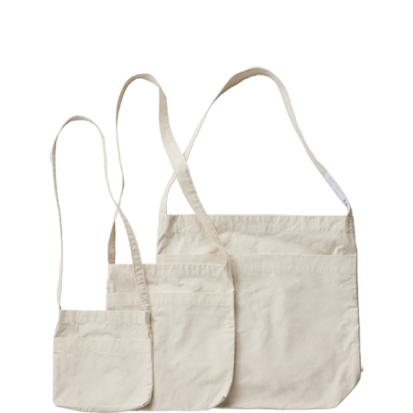 「服の外に出たポケット」としてつくられた、バディバッグは3サイズです。 ちいさな「2/3」(いままでの2/3の大きさ)は、スマートフォン・ハンカチ・お財布などこまごましたものを入れておくのにぴったり。 おおきな「3/2」(いままでの1.5倍の大きさ)は、デイリーで使うメインバッグにもなりそうです。 どのサイズも、肩からななめがけしたとき、ちょうど脇の下あたりでものが出し入れできて、作業しているとき、出かけるとき、いつも相棒のように、からだにぴったり寄り添って、ついてきてくれます。