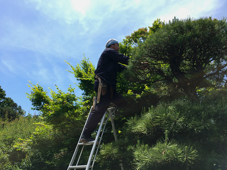 三脚を使って松を剪定しています。