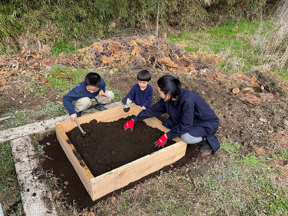 庭の隅に小さな畑をつくるという遊びをしました。
