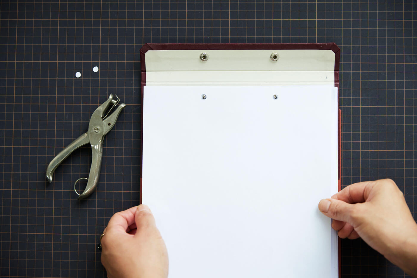 紙をそろえて上の端に2つ穴を開け、