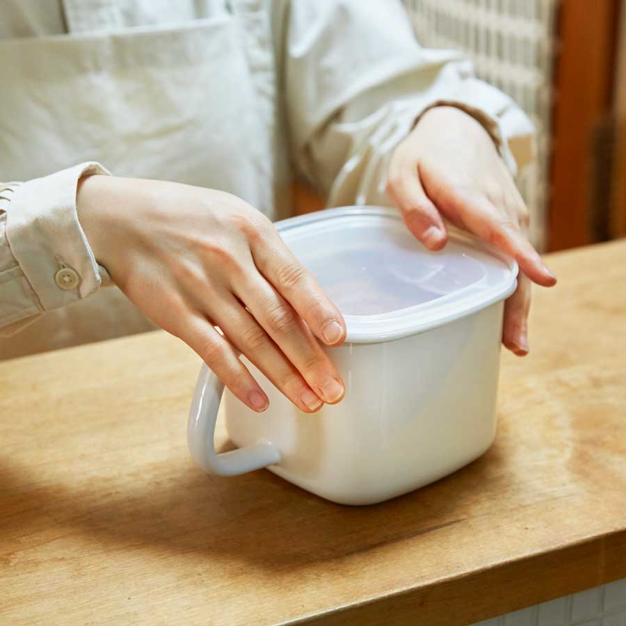 四角いかたちに取っ手がついた、琺瑯の容器。