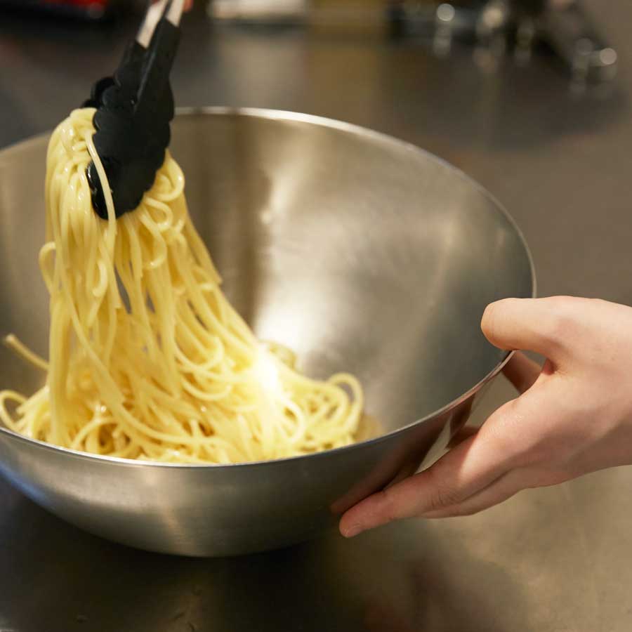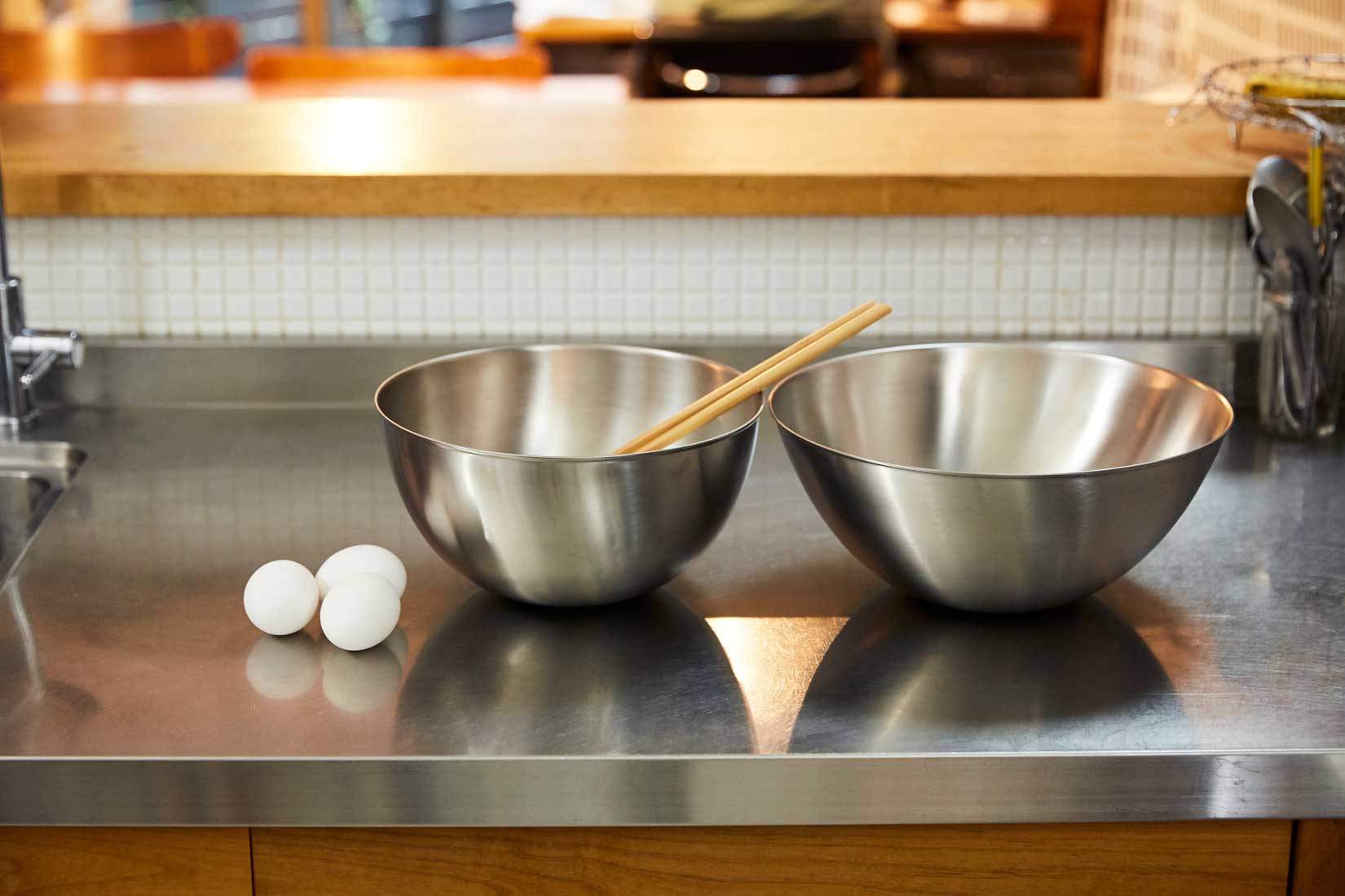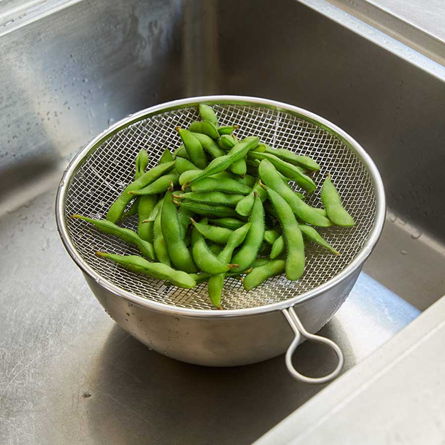 盆ざるで水切りして、ボウルの上に重ねておきます。