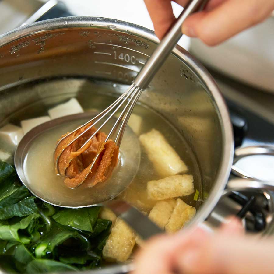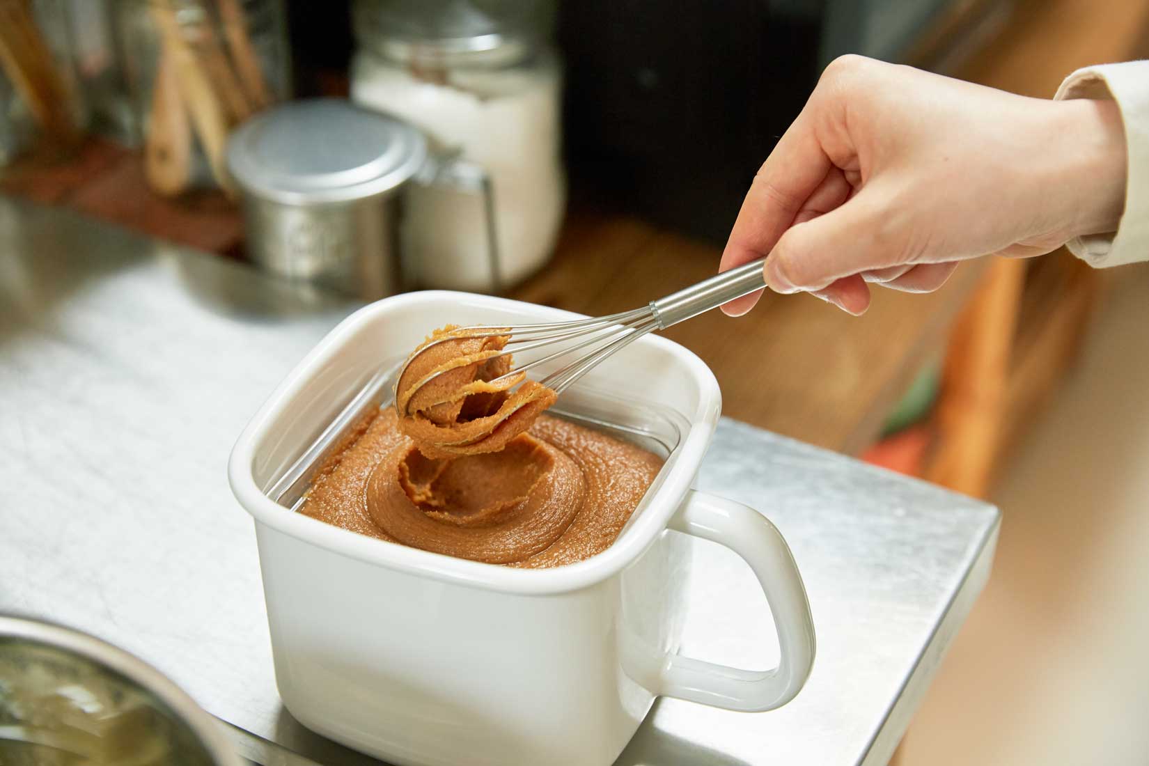 泡立て器の先の丸いところをお味噌に押し込んで、