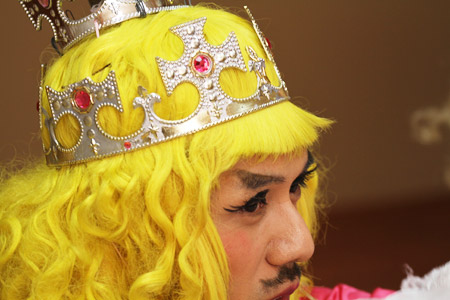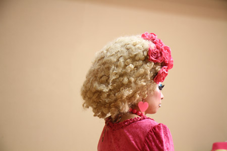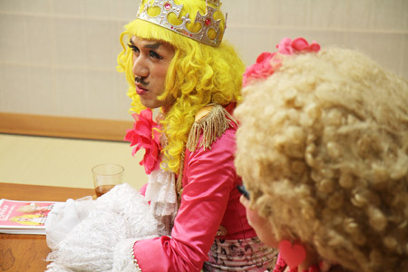 | TOBI | はい、ステージの上で緊張しないようにと、 金のカツラを被ったり、 派手な洋服を着たりして歌いました。 ここまで「プロ仕様」ではないですけれど。 |