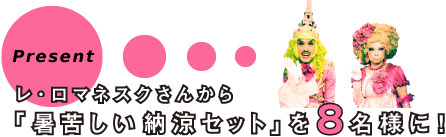 | ── | TOBIさんとMIYAさんからなる ポップデュオ「レ・ロマネスク」さんは 「パリでいちばん有名な日本人」として かの有名な「パリコレ」でライブをしたり パリの映画祭で かの有名な「ジェーン・フォンダさん」とともに 公式マスコットを務めたりされています。 |