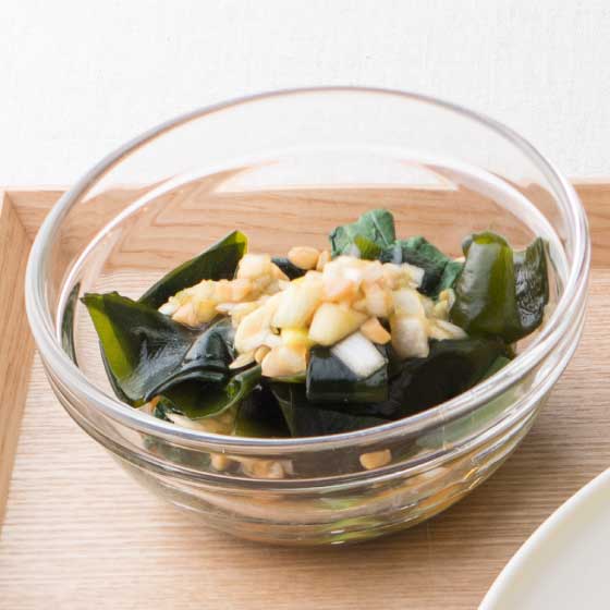 - 塩蔵わかめは水で戻して塩抜きし、食べやすく切ります。