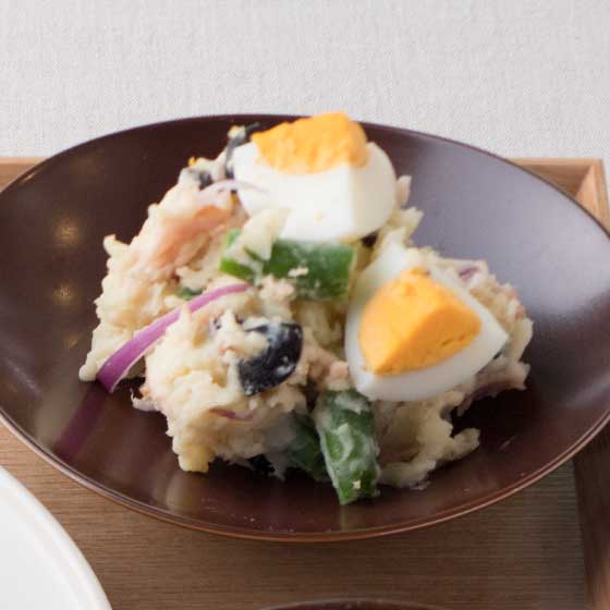 鍋に湯を沸かし常温の卵を9分茹でて水に取ります。 - 茹で上がったじゃがいもをつぶし、熱いうちに紫玉ねぎを加えます。