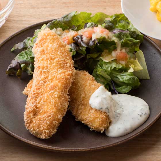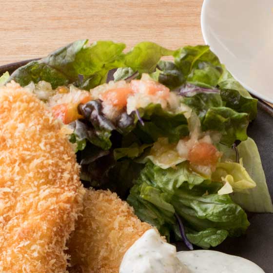 165~170℃の油で2分半~3分揚げます。 - 皿に、グリーンサラダ(後述)、ささみフライを盛り、