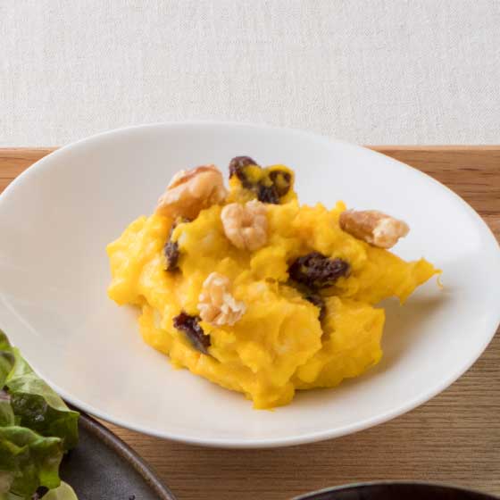 塩、こしょうで味付けします。 - 皿に盛り、レーズンとつぶしたくるみをあしらったらできあがりです。