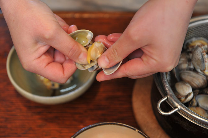 アサリの身をむきます。