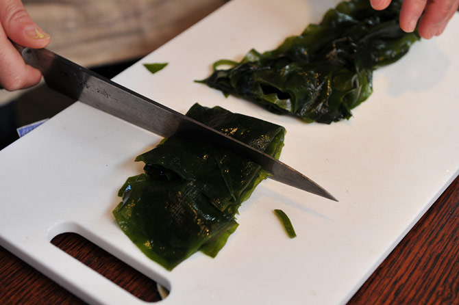 生わかめも、固い所を取り除き、5cm幅に切ります。