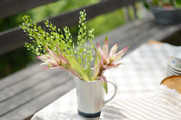 花瓶は大げさだけれど、こんなふうに花やグリーンを飾って。