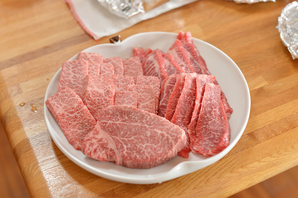 これは牛肉。焼き肉用と、ステーキ用を盛っています。