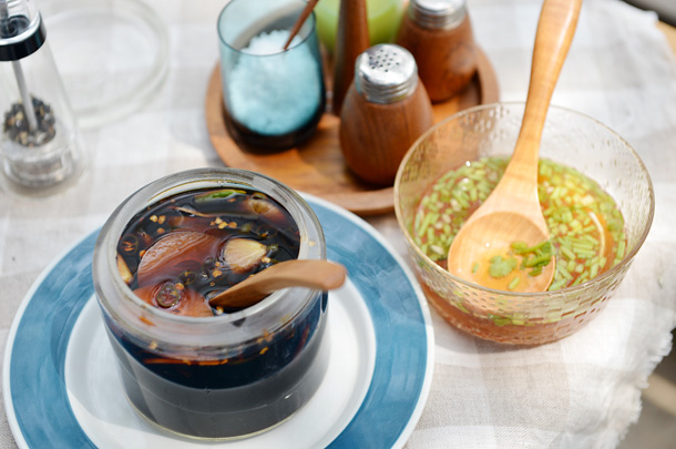 左側の調味料は、青唐辛子やにんにくの入った、おしょうゆベースのタレ。