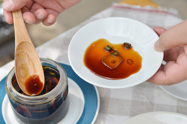 おしょうゆベースのお肉のタレを、小皿に準備。