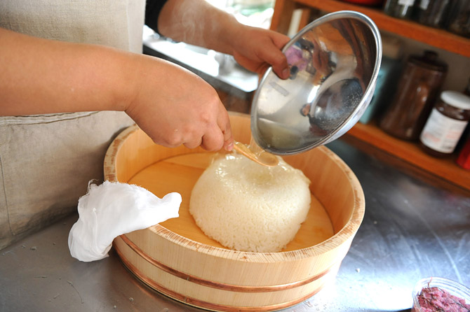 いったんしゃもじで受け止めて、全体にひろげます。