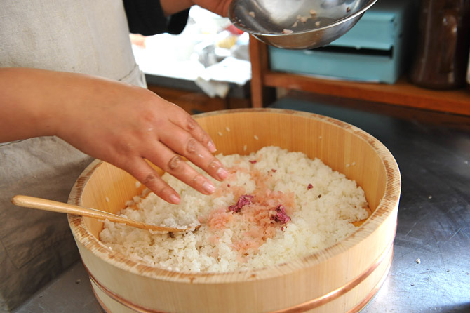 刻んでおいたさくらの塩漬けと、生姜の漬物を入れましょう。