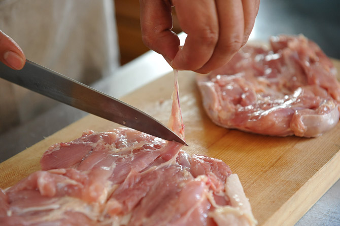 表に見える脂だけでなく、よぶんなすじ、血のかたまりも、はずします。