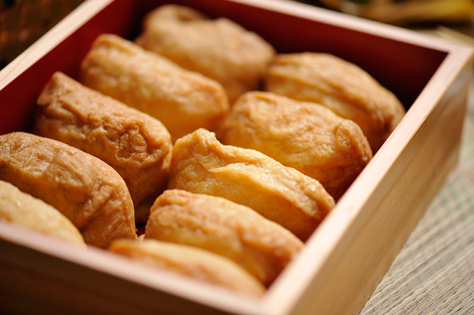 お重にならんだおいなりさん。かわいくて、おいしそう。