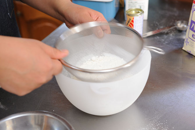 小麦粉とベーキングパウダーを、いっしょにふるいにかけます。