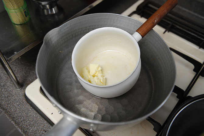 お鍋で湯煎をして、溶かしておきましょう。
