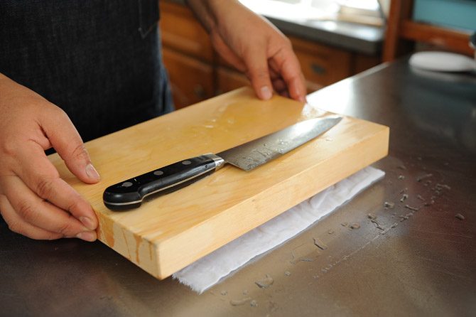 飯島さんが、まな板の下にぬれぶきんを敷きました。