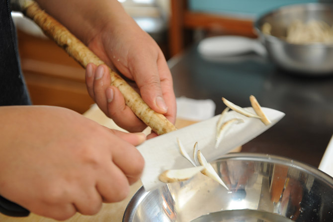 ゴボウをささがきにして、酢水につけておきます。