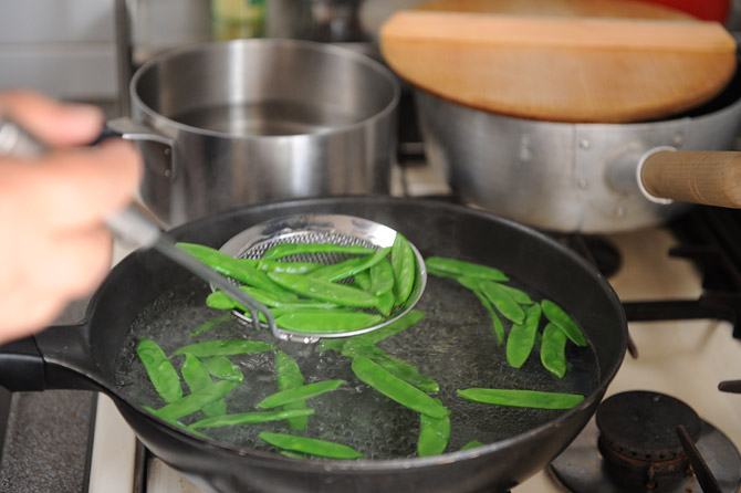 沸騰したらきぬさやを入れて、さっと茹でて、すぐにあげます。