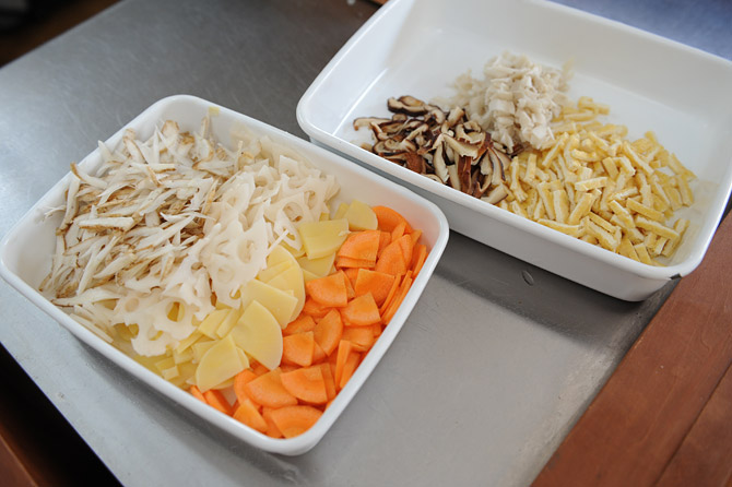 ゴボウ、レンコン、タケノコ、ニンジンは「薄め」に煮るチームです。