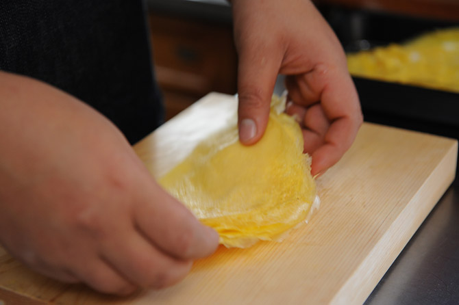焼き上がったら、とりだして、まな板の上で二つ折りに。