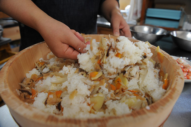 ごはんがあたたかいうちのほうが、じょうずに混ざりますよ。