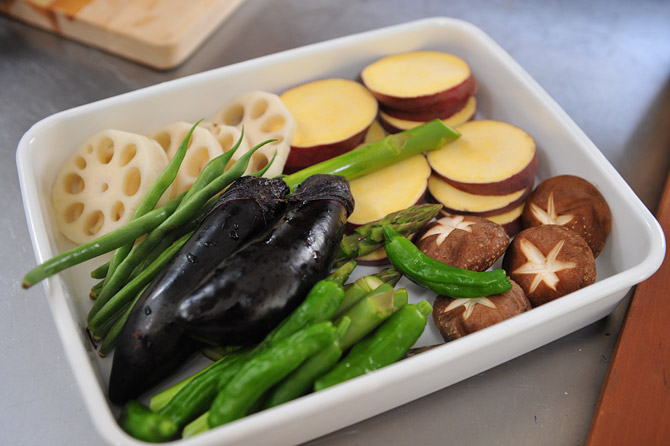 アスパラガス、ナス、シシトウ、椎茸など。
