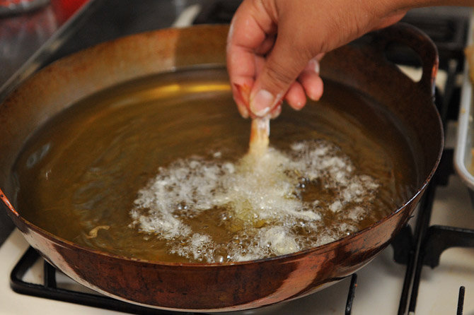 魚介類は175〜180度くらいまで熱した高温の油で揚げます。