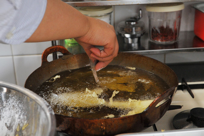 キスも同じように、粉をはたいて、衣をつけて、高温で。