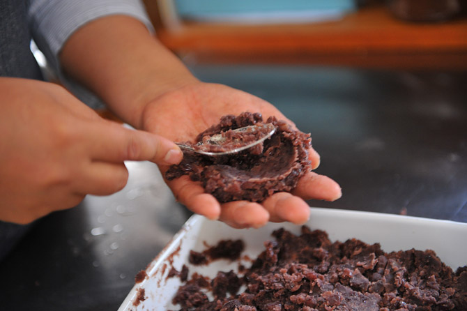 スプーンの背で、ごはんをのせる場所をつくります。