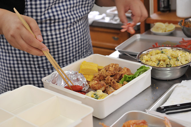 アルミホイルをしいて、ウインナーと、マカロニサラダ。