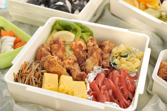 フライドチキン、ウインナー、甘い卵焼き、