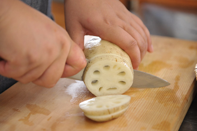 レンコンは、食べやすい厚さに輪切りにして‥‥